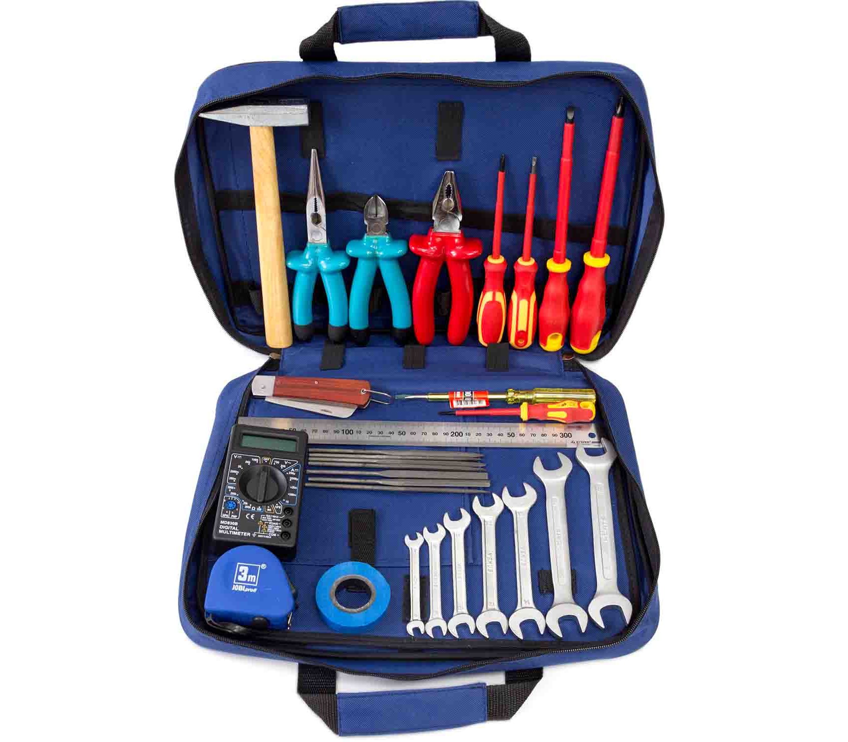 Включает в себя 24 предмета — изолированные отвертки, плоскогубцы, кусачки, мультиметр и набор рожковых ключей.